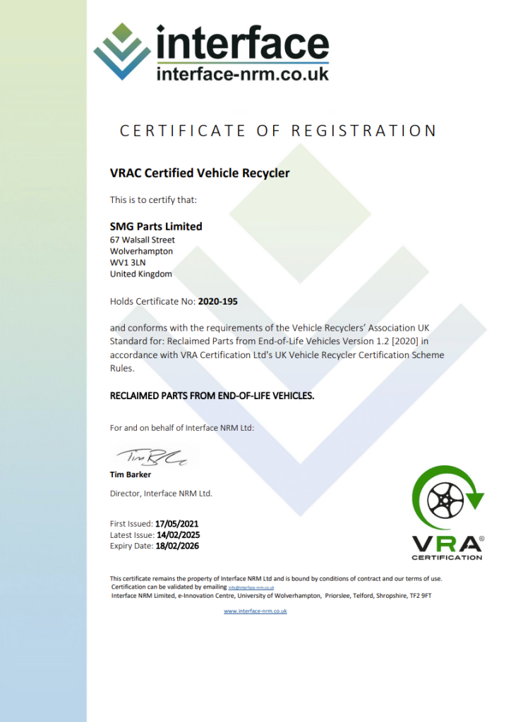 SMG Parts LTD is a well-established family business based in the West Midlands. We are licenced by the Environment Agency to run an Automotive Treatment Facility for End of Life Vehicles (ATF-ELV) The company was formed by Shahrokh Nabati in 2013 and is currently employing 10 staff, recycling hundreds of vehicles each year. The company’s 2-acre site is located in Wolverhampton and the large 23,000 sqft warehouse is in close proximity to the Wolverhampton train station and city centre. Over the years, SMG Parts LTD has earned an enviable reputation for good business practice and customer service, in what is recognised to be a highly competitive industry.